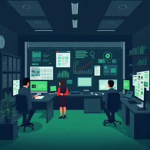abstract newsroom optimization illustration with AI assisting keyword research, meta description, data validation;