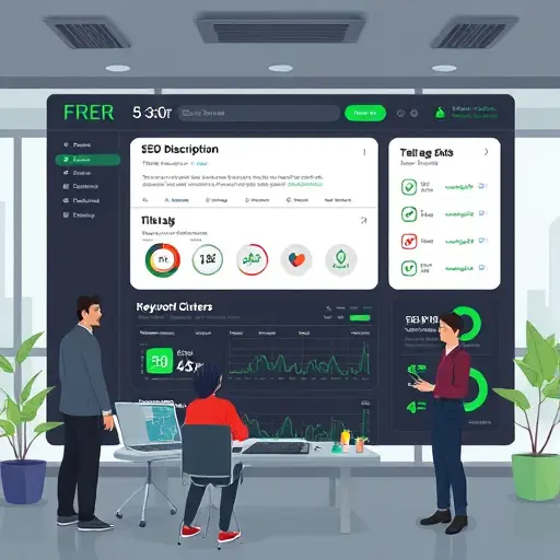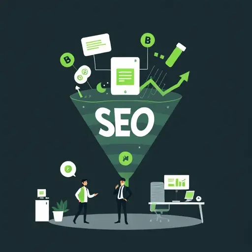 abstract illustration of AI and SEO synergy, icons for meta tags, keywords, analytics graphs, dark background with green accents (#94d3a2)